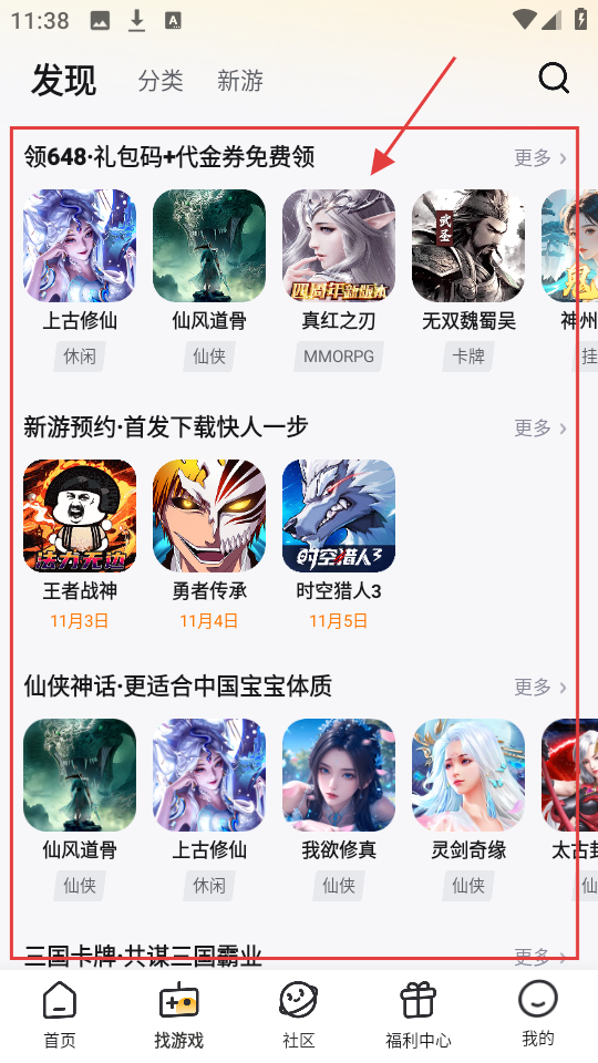 3、发现页面有不少游戏分类和新游,像上古修仙、仙风道骨等,挑喜欢的玩呀。