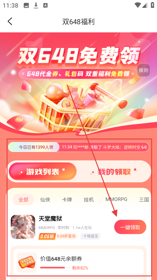 4、双648福利里有免费领的代金券和礼包码,点【一键领取】就能拿到,超棒呢。