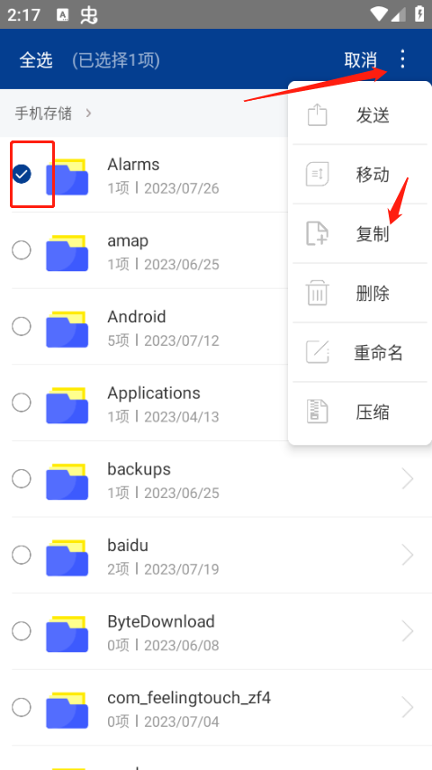 3、选择需要复制的文件,点击右上的三个点,选择复制。