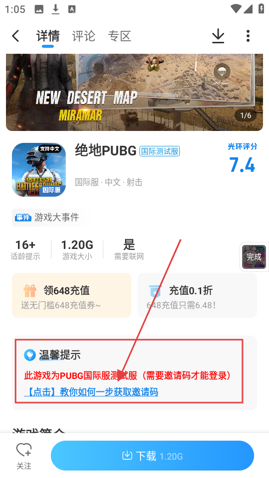 4、在《绝地PUBG》国际测试版详情页,看到需邀请码登录的温馨提示,点击指引可查看邀请码获取方法啦。