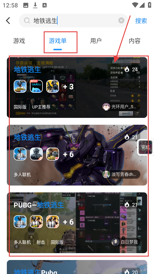 4、若想找游戏单,在搜索结果页面,点击【游戏单】标签,就能看到相关游戏单,挑选喜欢的游戏单啦。