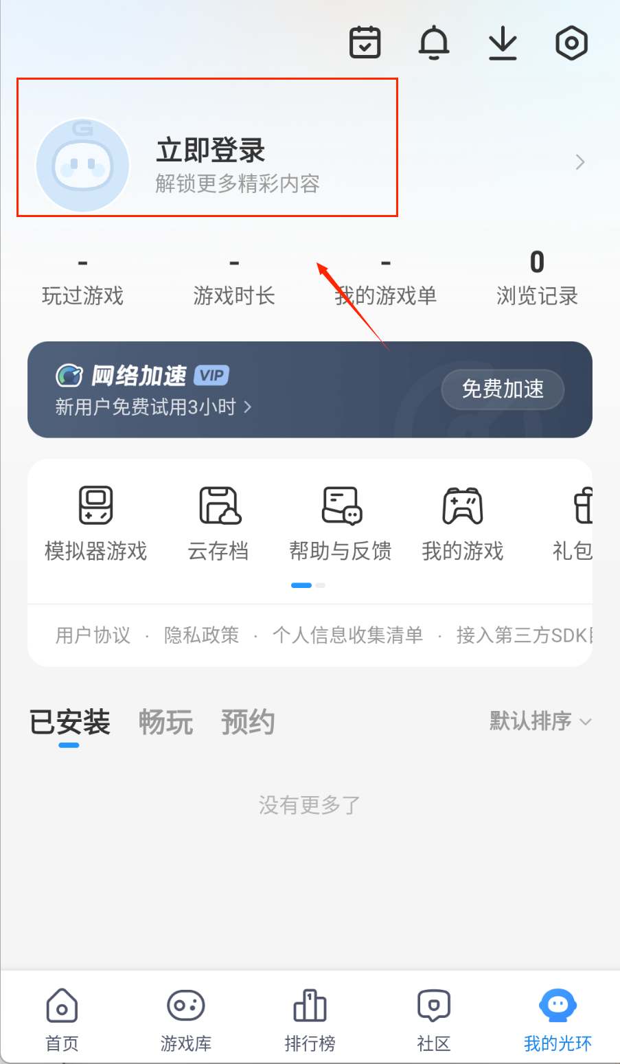 1、打开软件后首先完成账号登录,点击右上角"立即登录"按钮,注册或登录后可以解锁更多功能,比如查看个人游戏记录和收藏列表。