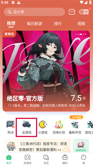 1、在首页的分类专区可以找到云游戏专区打开。