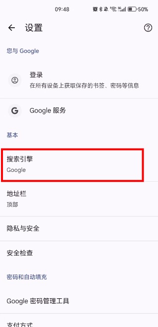 3、在【设置】页面的“基本”分类下,找到【搜索引擎】选项,当前默认引擎为Google,点击可进入引擎选择界面。