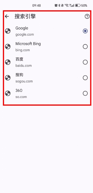 4、在【搜索引擎】页面,提供了Google、Microsoft-Bing、百度等多个选项,可选择对应引擎设为默认,调整搜索工具偏好。