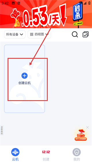 1、在云机页点【创建云机】按钮,能进入套餐选择界面,后续可挑选合适的云机套餐来创建啦。