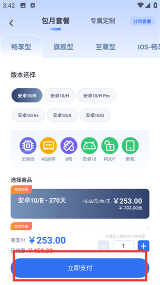 2、选好云机套餐后点【立即支付】按钮,完成支付就能成功创建对应的云机,开始使用啦。
