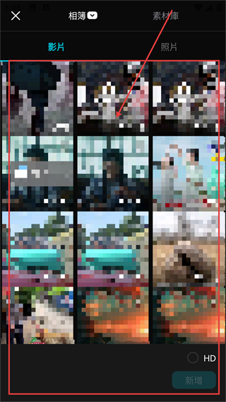 2、进入相簿素材页,选择目标影片素材后点击【新增】按钮,即可将素材导入到创作轨道中哦。