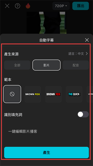 4、在自动字幕面板中,选定【影片】来源并选好范本,点击【產生】按钮,即可生成对应视频的字幕啦。
