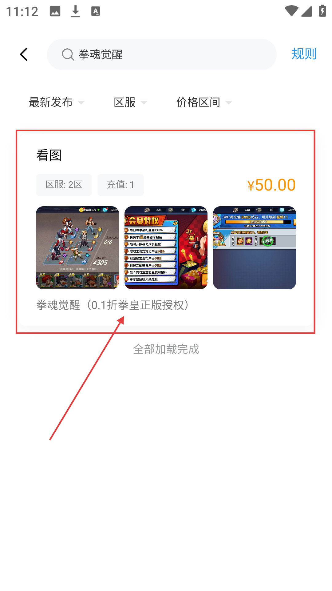 2、在游戏搜索界面输入游戏名称,如【拳魂觉醒】,找到对应的游戏角色交易列表啦。