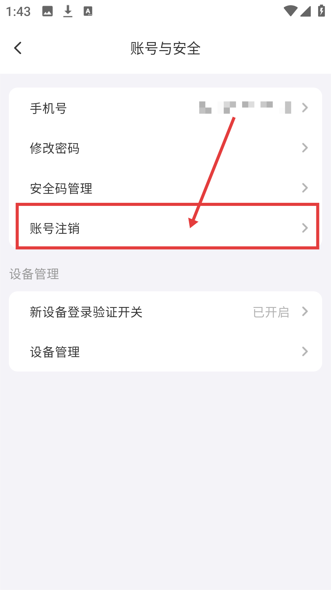 3、在账号与安全界面点击【账号注销】,进入账号注销规则说明界面哦。