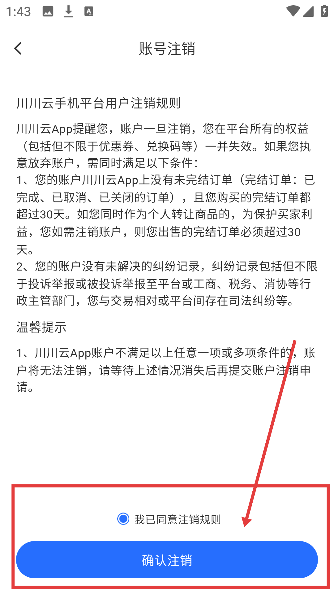 4、在账号注销规则说明界面勾选【我已同意注销规则】,点击【确认注销】,即可提交账号注销申请啦。