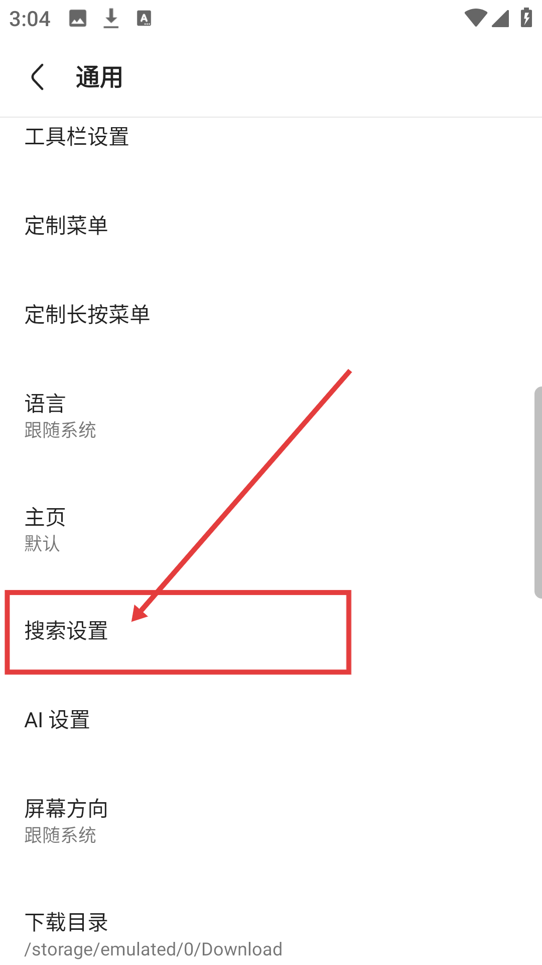 2、在通用设置里,点【搜索设置】,能进入搜索相关的配置页面啦。