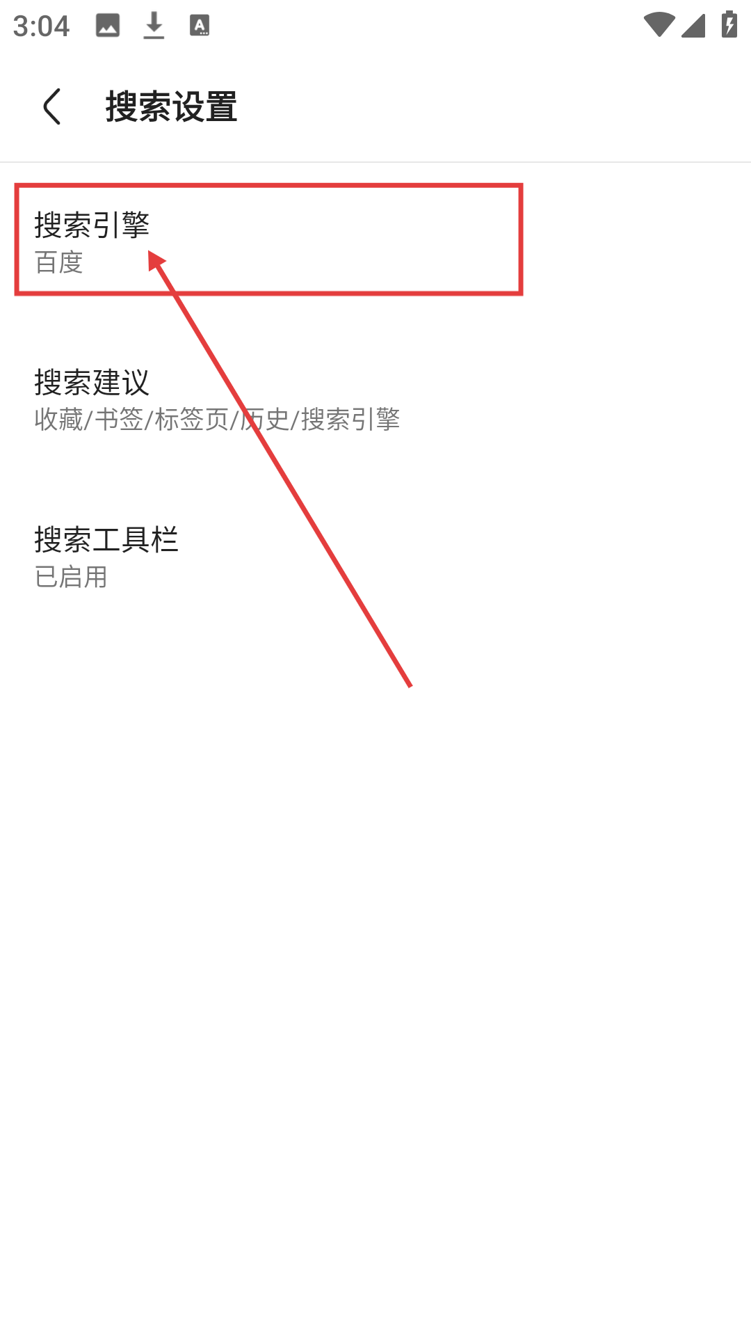 3、在搜索设置中,点【搜索引擎】,可进入搜索引擎的选择界面呢。