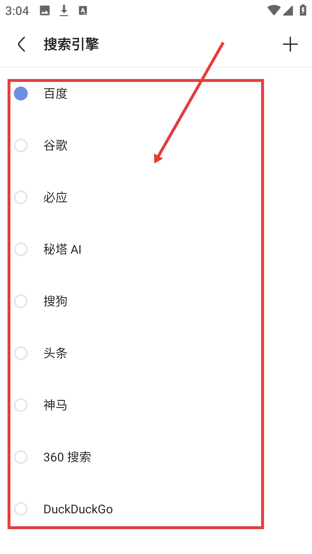 4、在搜索引擎页面,可选择喜欢的引擎如【百度】【谷歌】等,切换默认搜索工具哦。