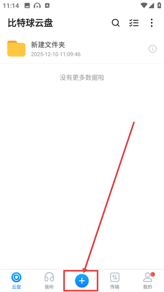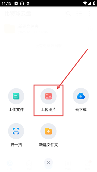 1、在【比特球云盘】主页面点击底部的加号按钮,就能打开功能操作面板,准备进行上传等操作啦。