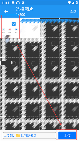 3、在选择图片页勾选想要上传的图片,然后点击底部的【上传】按钮,就能把选中的图片传至云盘啦。