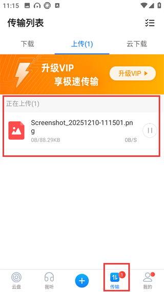 4、点击【传输】选项进入传输列表,就能看到正在上传的图片进度,实时查看上传状态啦。