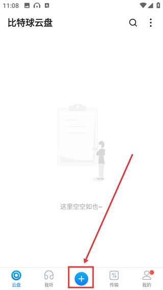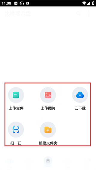 1、在比特球云盘首页点底部的【+】按钮,能展开功能菜单,后续可进行上传或新建等操作啦。
