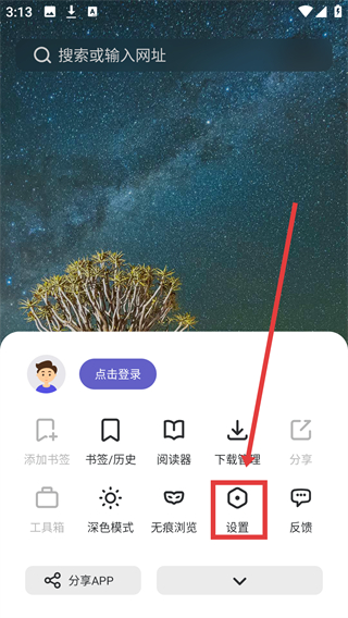 1、在浏览器功能菜单里,点【设置】,可进入设置界面调整各项选项哦。