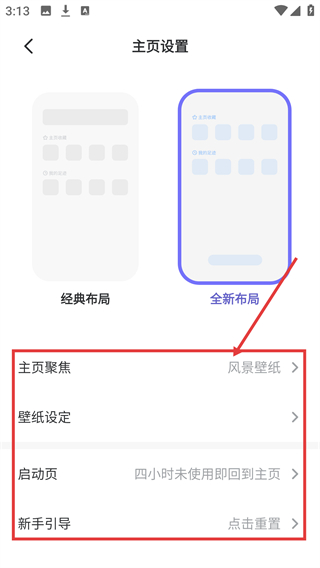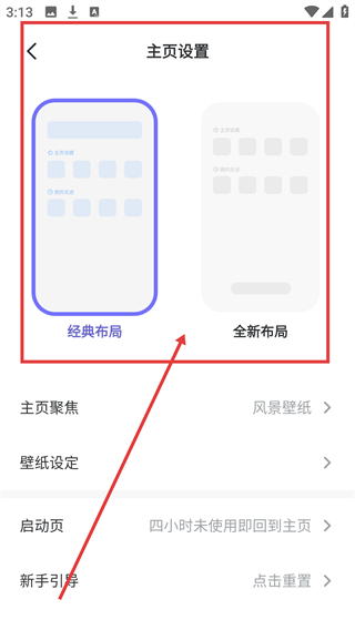 3、进入主页设置,可选择【经典布局】或【全新布局】来切换主页样式呢。