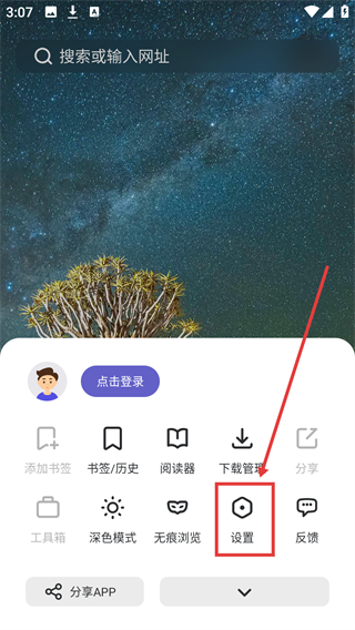 1、点击【设置】,进入设置界面,可进行浏览器功能设置哦。