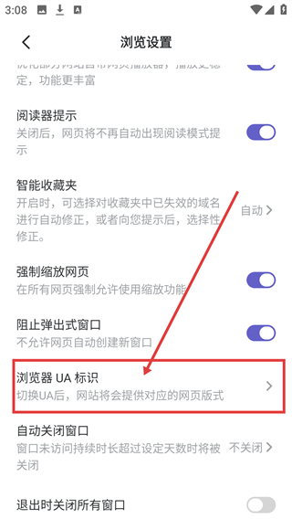 3、在浏览设置界面点击【浏览器UA标识】,进入UA标识设置界面,开始调整UA标识哦。