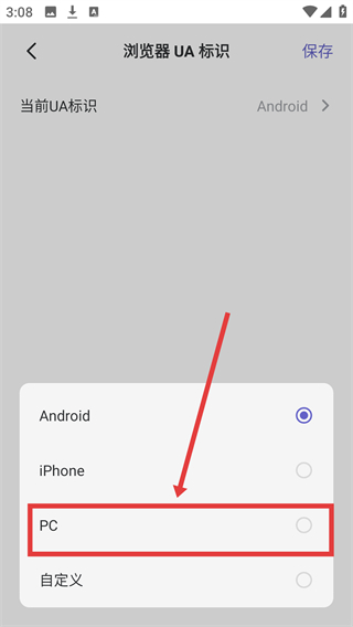 4、在UA标识设置界面选【PC】,即可将浏览器UA标识切换为PC端,获得PC端网页版式啦。