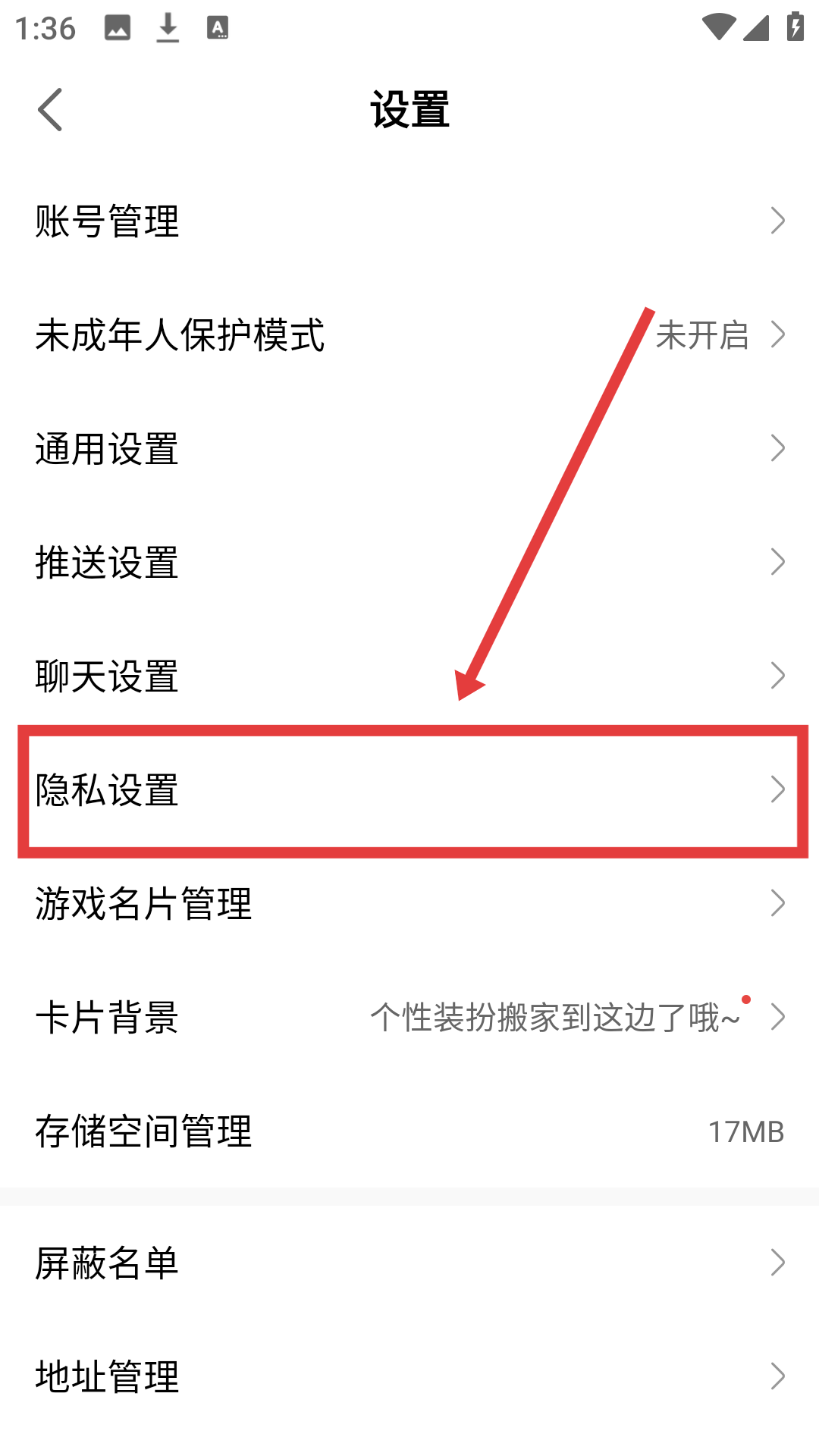 3、在设置页面,点击【隐私设置】,可进入隐私设置页面,调整隐私相关选项啦。