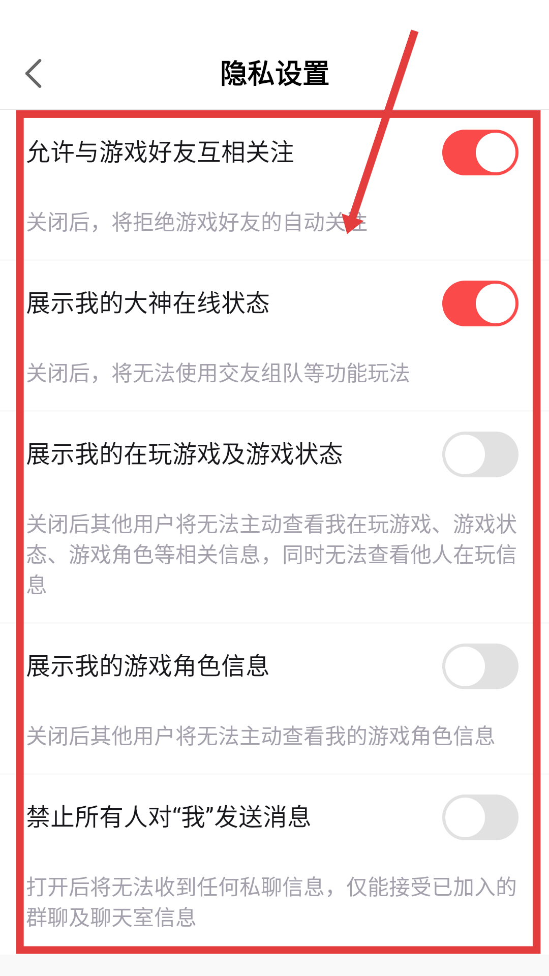 4、在隐私设置页面,可对允许与游戏好友互相关注、展示在线状态等选项进行开关设置,保护个人隐私哦。