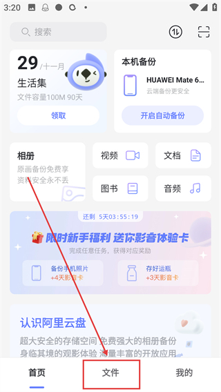 1、在阿里云盘APP的首页,点击底部的【文件】选项,切换到文件管理界面,可进行文件的上传或管理操作啦。