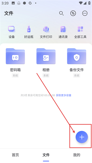 2、进入文件页面后,点击右下角的【+】按钮,会弹出操作选项菜单,可选择添加文件的方式哦。