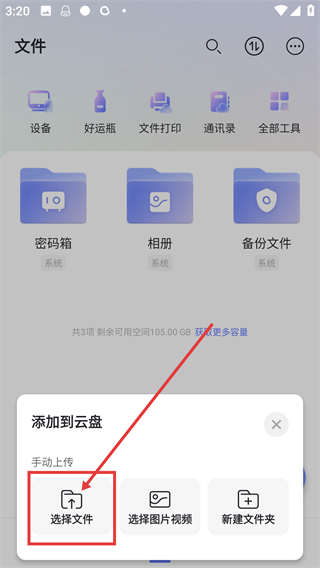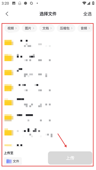 3、在弹出的菜单中,点击【选择文件】选项,进入设备的文件选择界面,挑选要上传的文件呀。