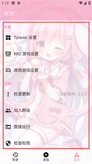 4、配置好后回到其他页,能看到【Tyranor设置】等选项,可在这里调整已添加游戏的相关参数哦。