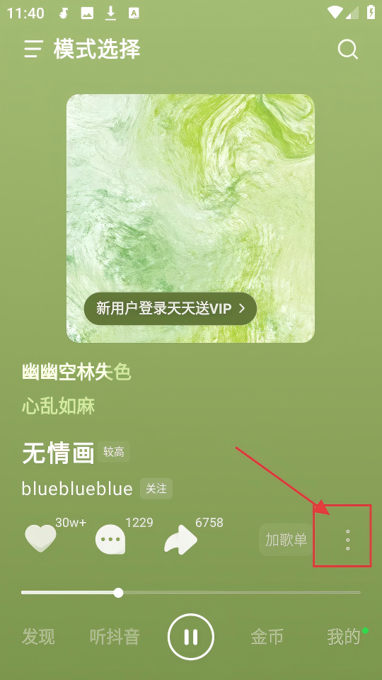 1、在APP播放歌曲时,点击右侧三点图标,能展开更多操作选项,方便设置歌曲相关功能呢。