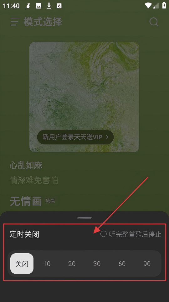 3、进入定时关闭设置界面,可选择听完整首歌后停止,或设置10、20等时长后关闭,按需选择啦。