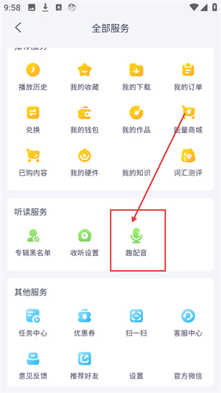 1、在全部服务页,点【趣配音】选项能进入配音活动页面,参与故事片段的配音互动啦。