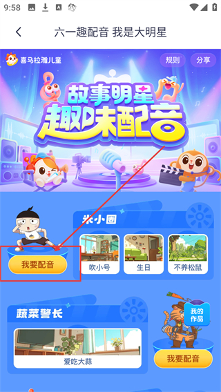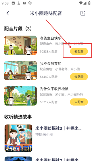 2、进入趣配音页后,选喜欢的故事比如【米小圈】,点【我要配音】就能进入该故事的配音片段列表哦。