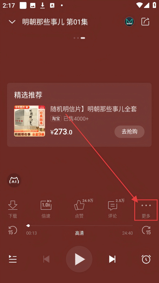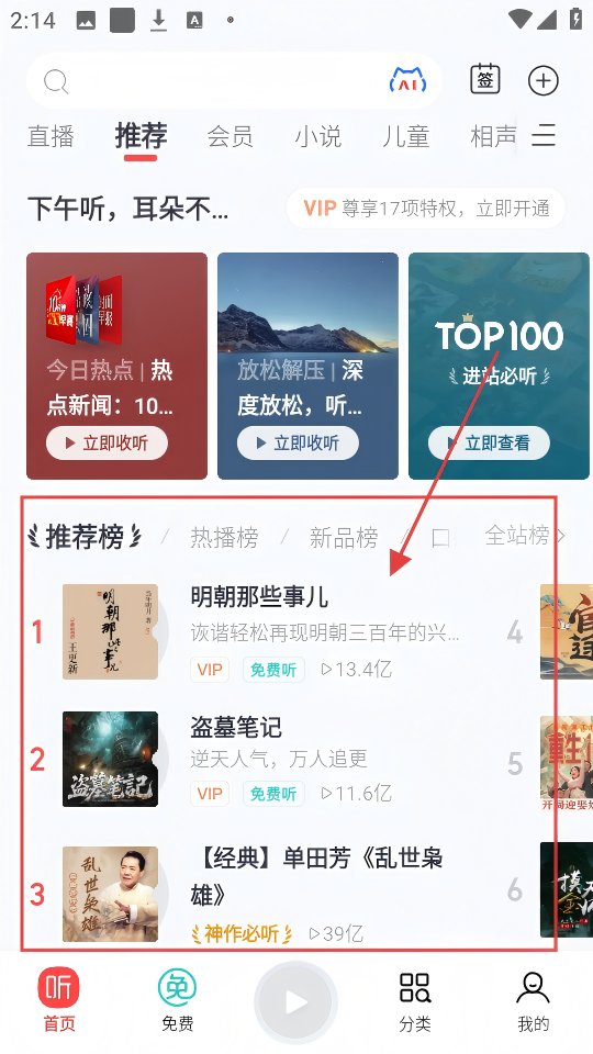 1、推荐页有推荐榜,里面有【明朝那些事儿】等热门有声内容,选感兴趣的点进去。