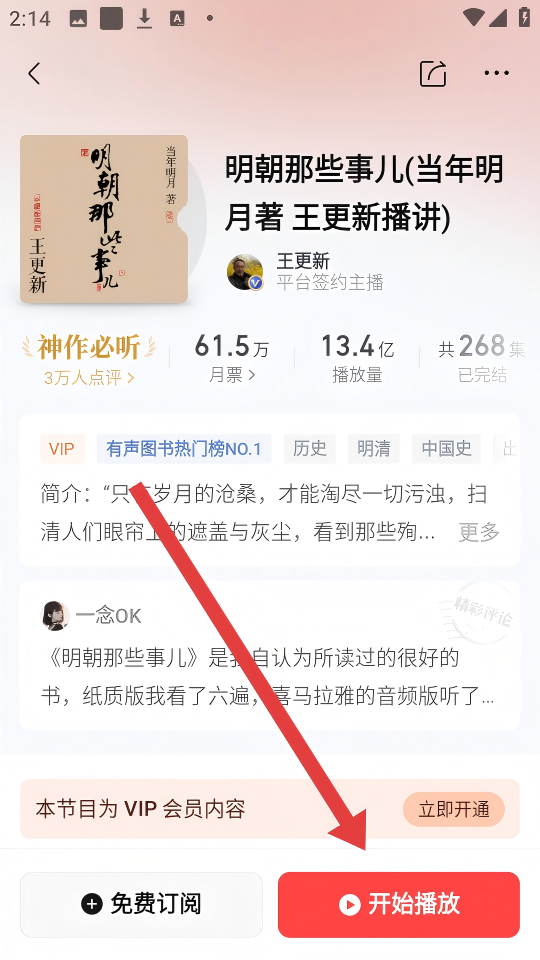 2、进入【明朝那些事儿】详情页,若想收听,点击【开始播放】按钮,就能开启收听啦。