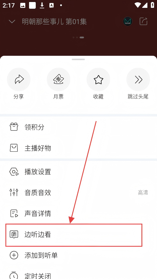 4、展开更多选项后,有【边听边看】功能,开启它,能边听音频边看相关内容啦。