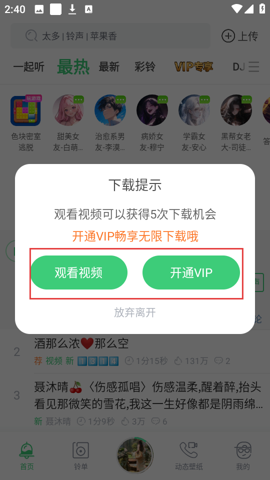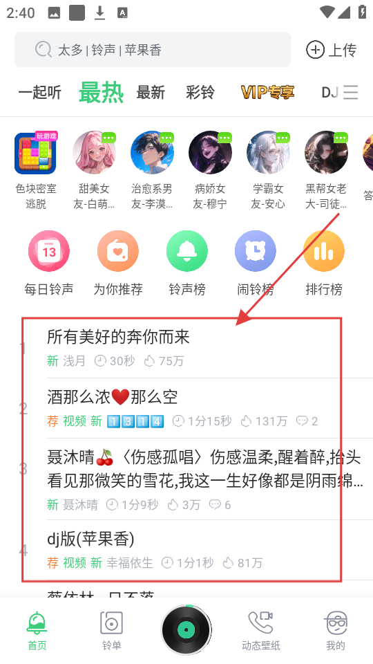1、最新最热频道,DJ、情感、动漫总有你喜欢的一款,点击点开试听,如果还行就可以设置了。