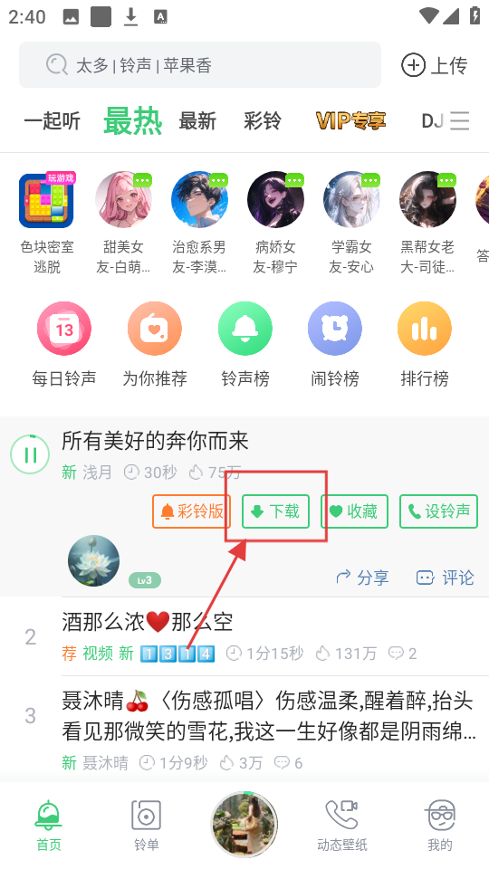 1、打开APP,在首页“最热”榜单中,挑选心仪的铃声,准备进行下载操作啦。