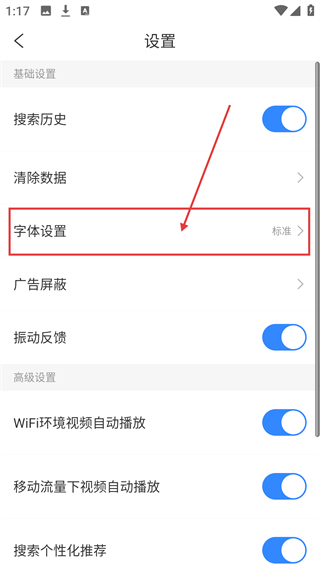 3、在设置页,点【字体设置】选项能进入字体调整页面,可自定义网页显示的字体样式哦。