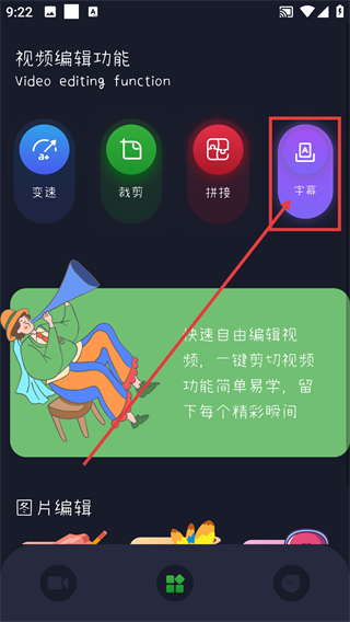 2、在视频编辑功能页选择【字幕】选项,就能进入视频字幕的编辑页面,准备给视频加文字啦。
