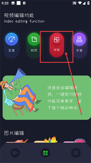 2、进入编辑页后点【拼接】选项,能启动视频拼接功能,可将多个视频片段拼接成一个哦。