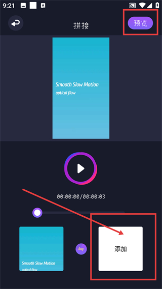 4、在拼接页点【添加】按钮可继续加视频,完成后点【预览】能查看拼接效果,很方便呀。