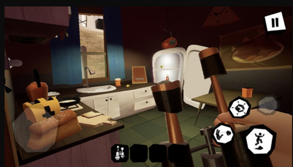 2、由于游戏采用了第一人称视角,所以整体代入感很强,尤其是刚开始被大叔发现的时候,主人公挥舞着双手无所适从,而邻居却直直的冲向你,画面越来越黑,那张大脸越来越近最后消失,玩到后面章节其实你也可以和邻居过两招挣扎一下甚至逃走的。