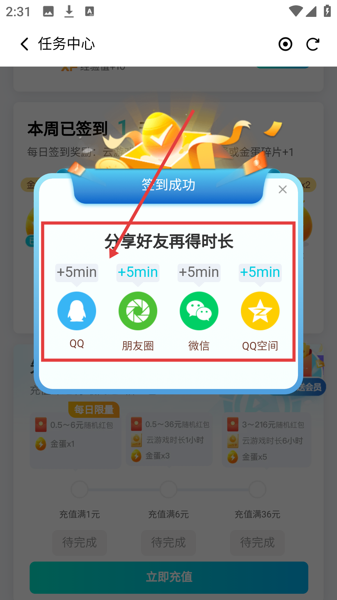 3、签到成功后,可选择分享渠道,如QQ、朋友圈等,分享后再得游戏时长哦。