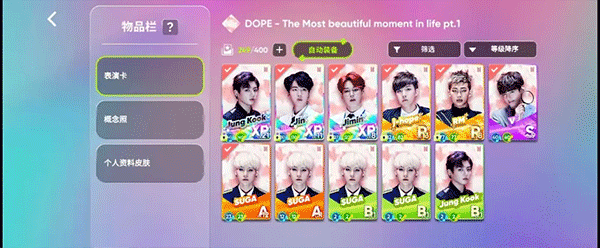 5、比如我这里Boy With Fun形成这样阵容的原因,就在于bang bang con和花1 dope的主题卡都可以演出Boy With Fun,但Suga和V的卡片在花1 dope中的级别低于在bang bang con中的级别